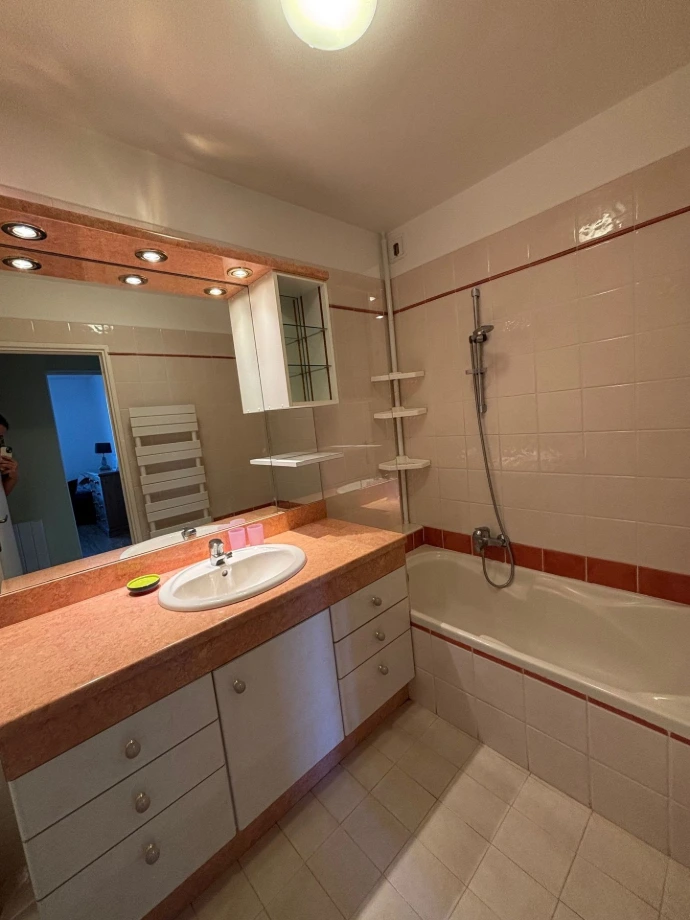 Salle de bain : une baignoire, un meuble vasque, un placard avec le lave-linge.