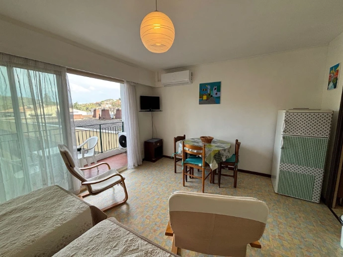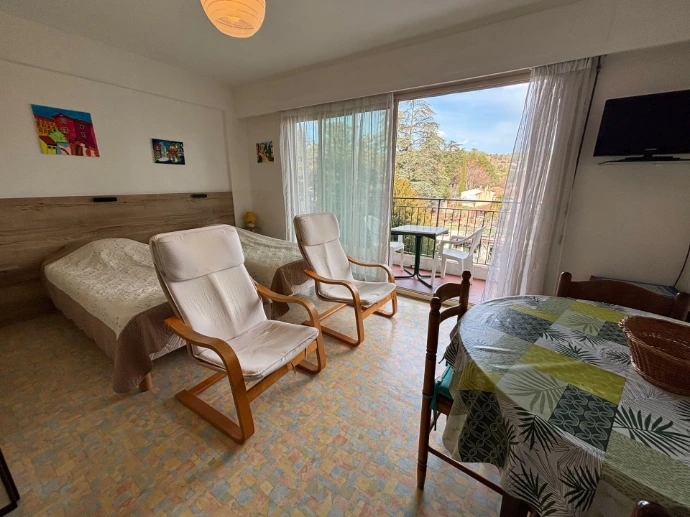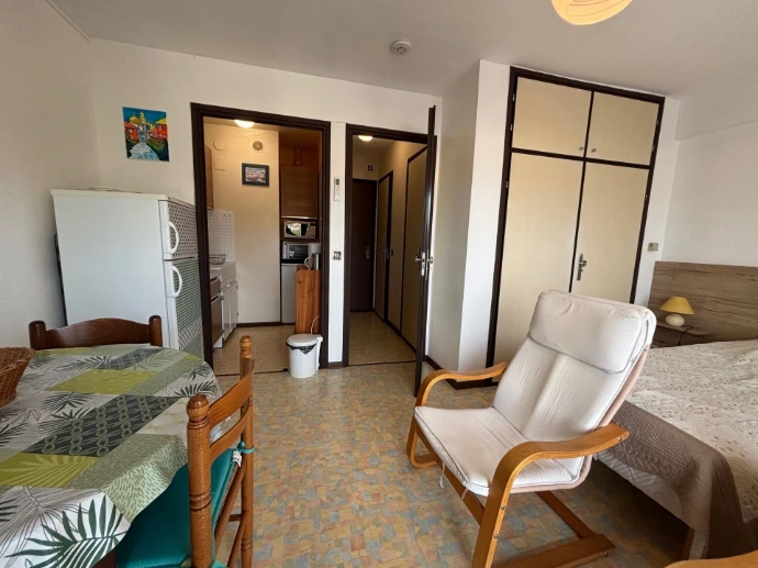 Le studio est composé d'une pièce principale avec 2 lits en 90x190, coin télé avec 2 fauteuils, table et 3 chaises, armoire penderie.
