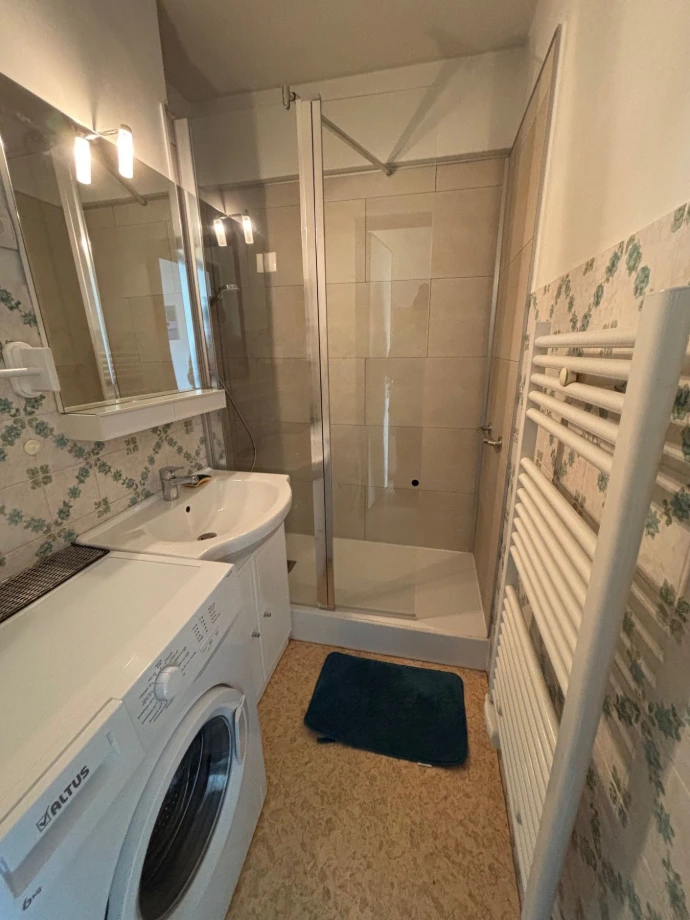 Une salle de bain avec douche, lavabo, lave-linge et rangement, le WC est séparé.