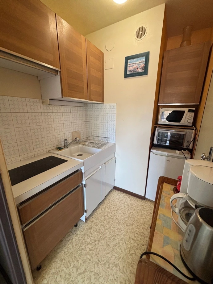 Coin cuisine équipé d'un micro-onde, mini-four et plaque 2 feux électriques, réfrigérateur congélateur, cafetière, bouilloire électrique, grille-pain, aspirateur, fer et table à repasser.